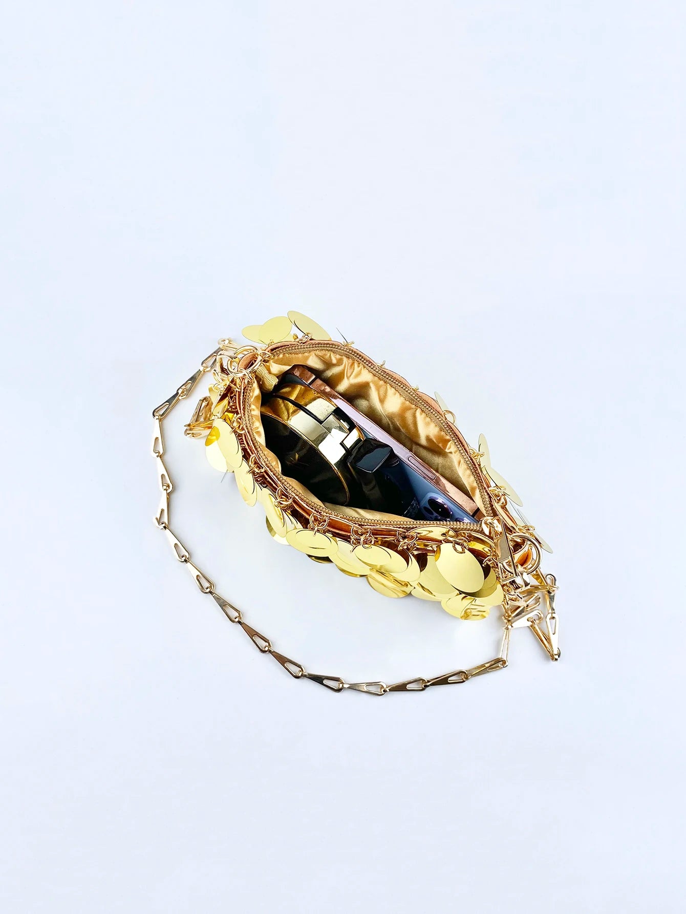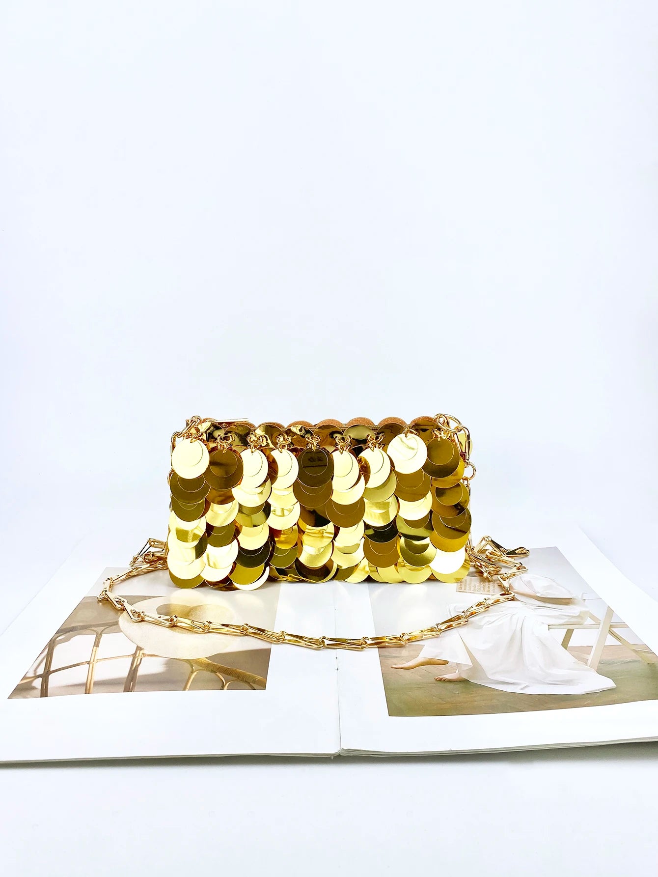Découvrez le sac WÆZE en bandoulière, il incarne l’audace et l’élégance contemporaine. Orné de pastilles métalliques en couleur or, il reflète la lumière avec éclat, apportant une touche de glamour futuriste. Son design iconique, à la fois structuré et souple, en fait une pièce phare parfaite pour sublimer une tenue sophistiquée et ainsi vous faire briller de mille feux lors de vos événements.