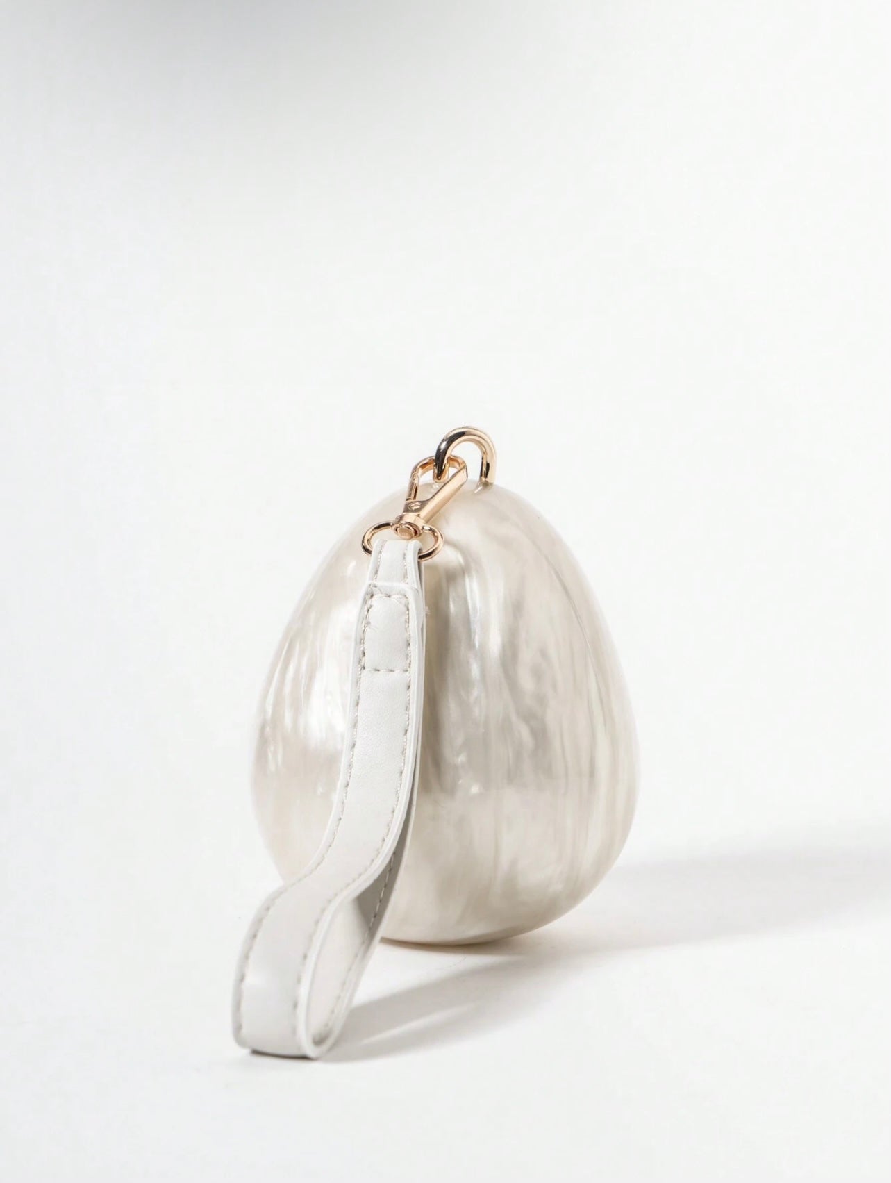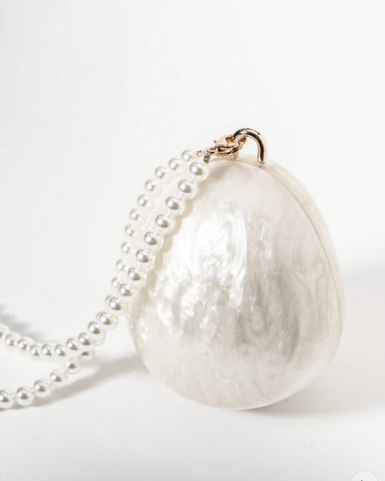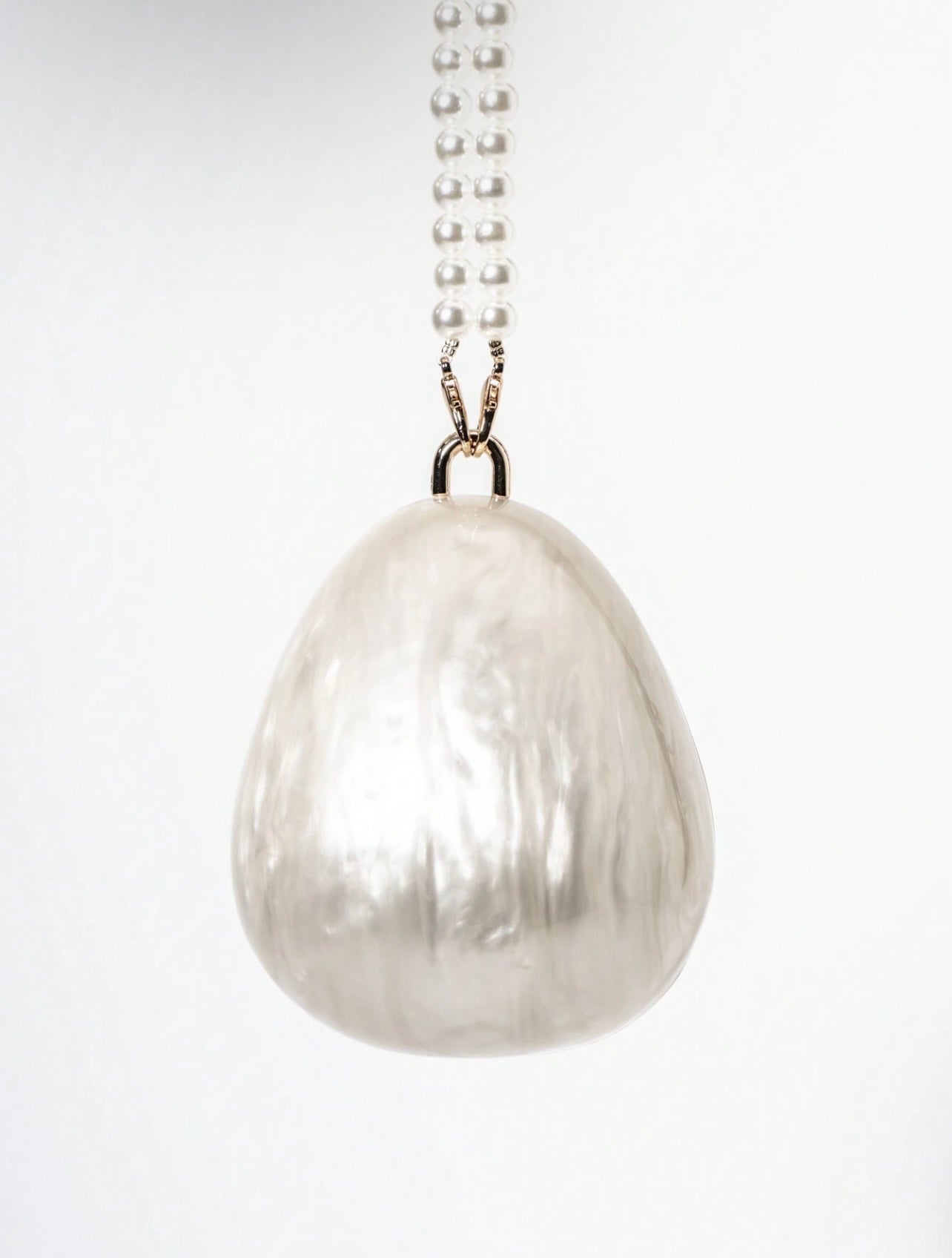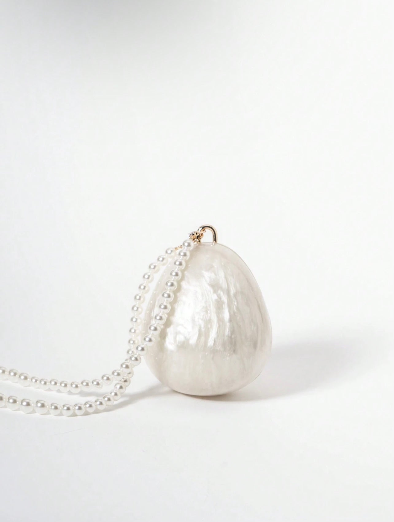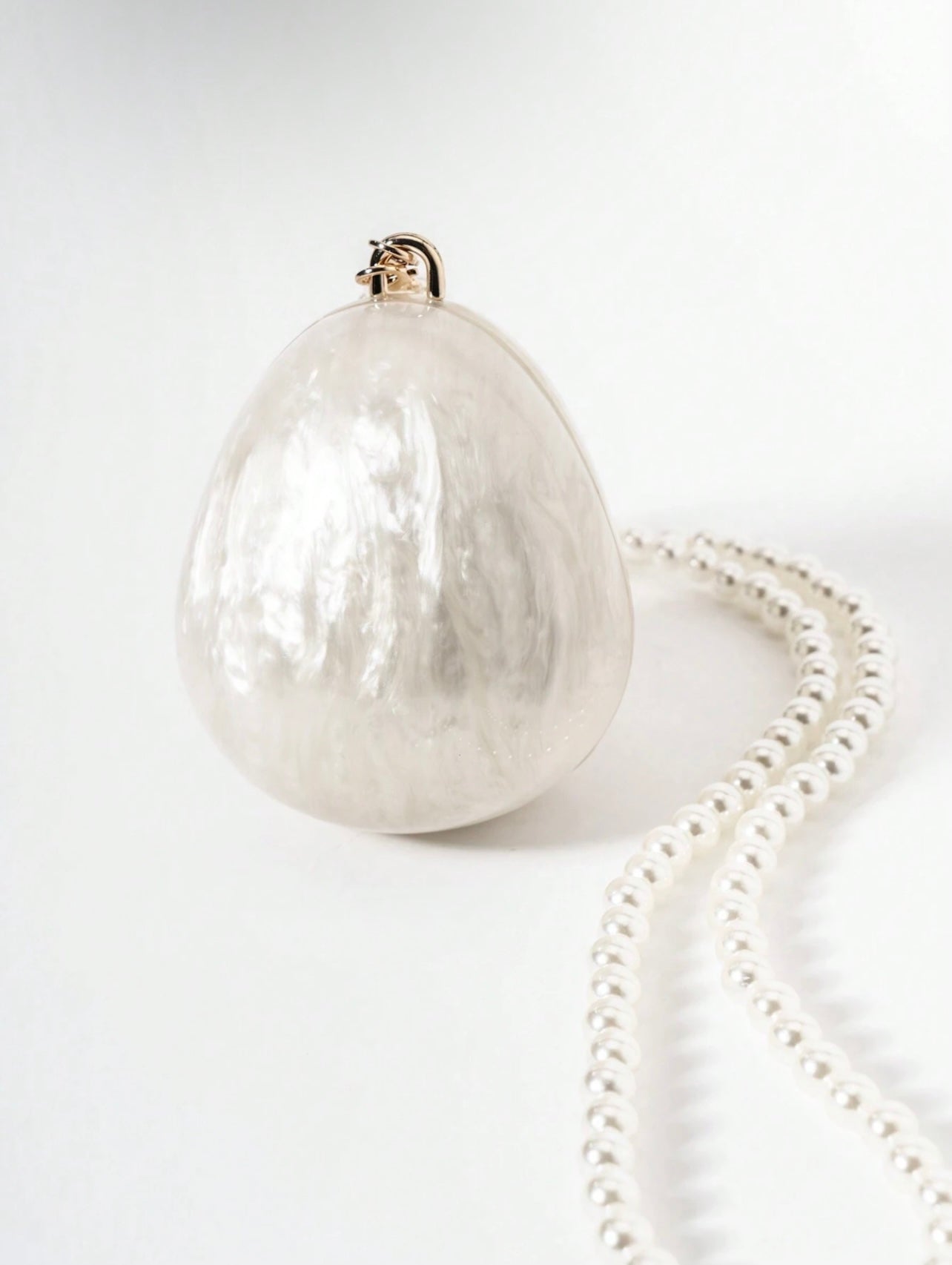 Découvrez le sac EÆYG, ovoïde en acrylique laitière, alliant modernité et élégance. Sa forme unique et sa finition brillante se complètent parfaitement avec une petite sangle perlée, ajoutant une touche délicate et raffinée à votre look. Un accessoire parfait pour sublimer votre tenue.