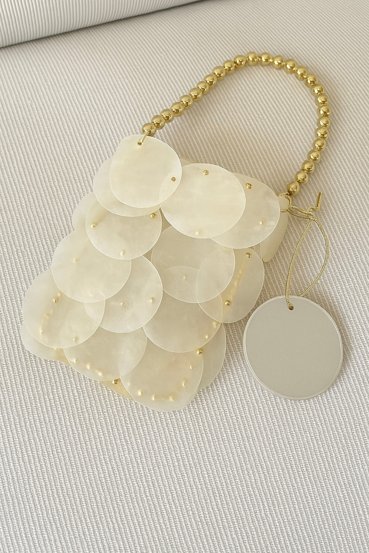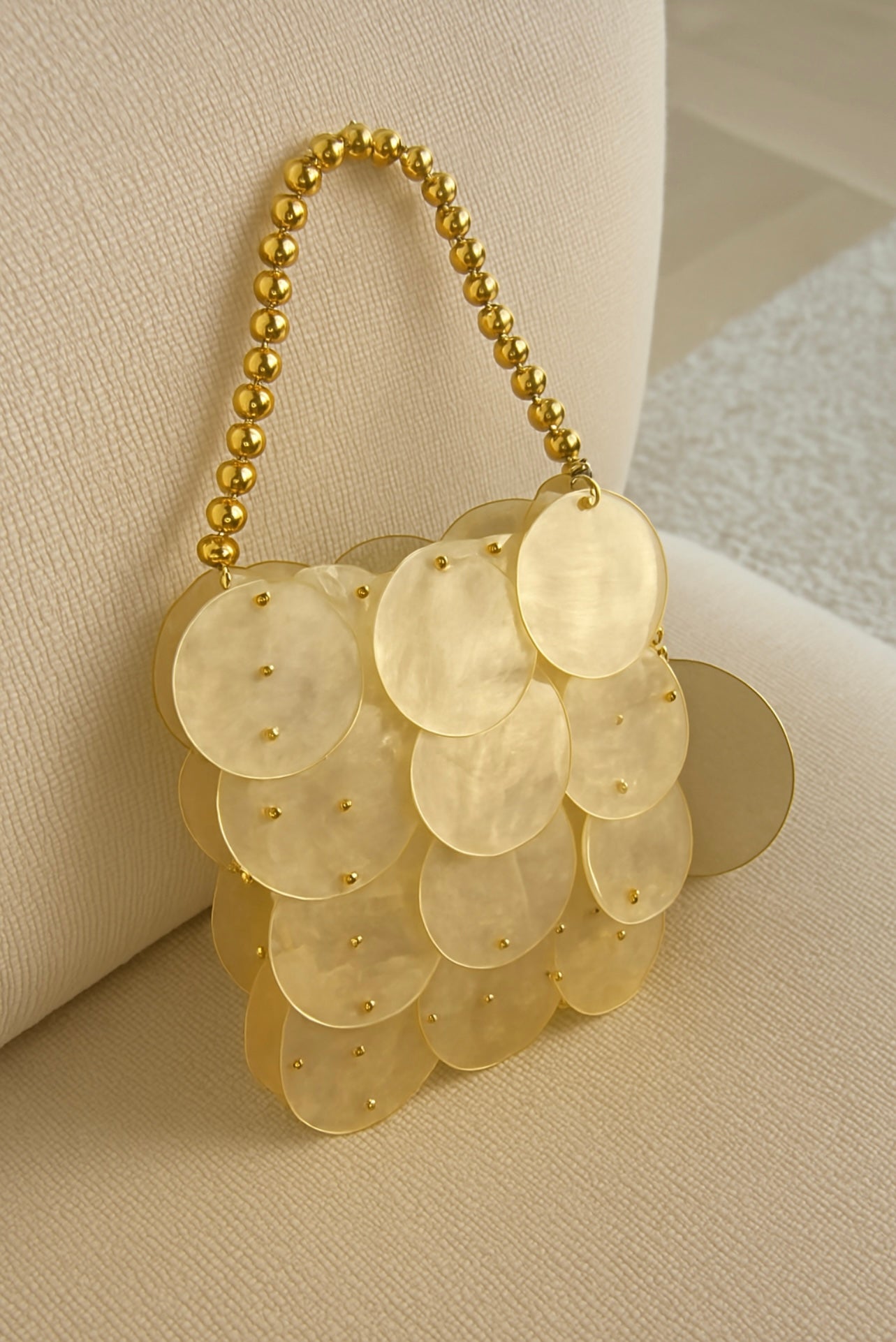 Découvrez le sac PÆCO, raffiné séduit par son design unique, composé de disques translucides nacrés subtilement assemblés, créant un jeu de lumière délicat. Son anse en perles dorées apporte une touche précieuse, fusionnant artisanat et modernité. Une pièce rare qui capte le regard et sublime chaque tenue avec grâce.